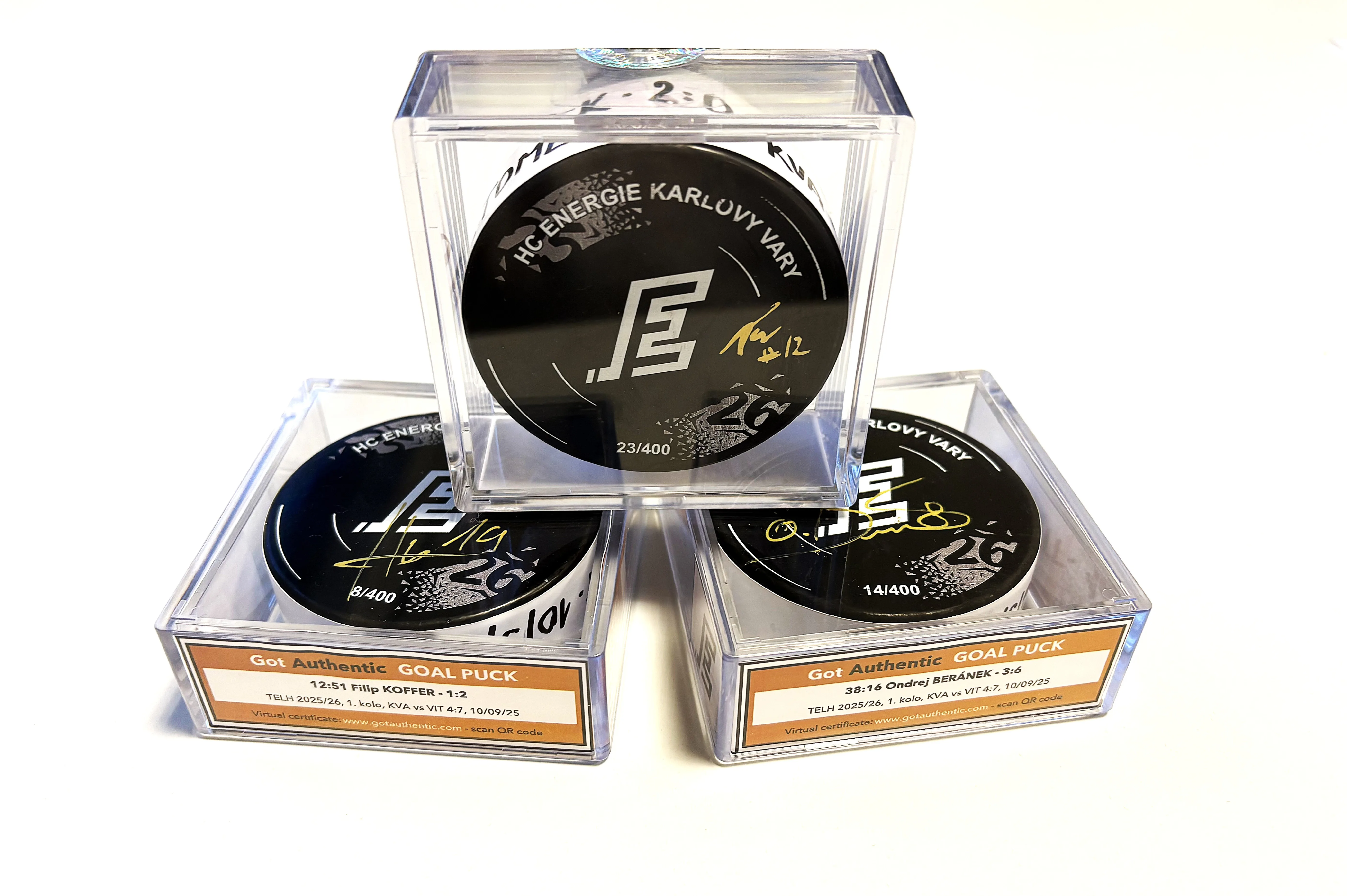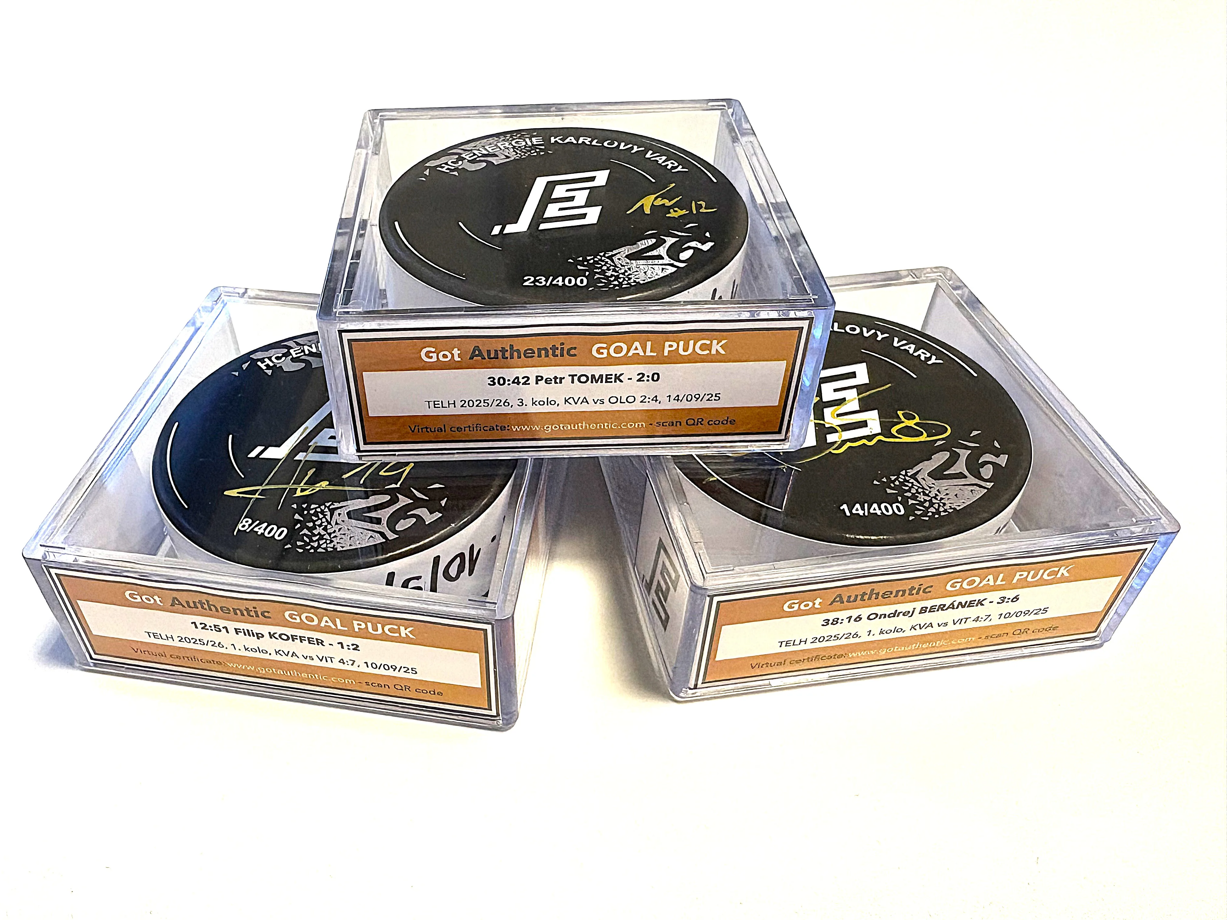 Unikátní gólové puky HC Energie Karlovy Vary z aktuální sezony 2025/26 – certifikované originály s podpisy střelců a QR kódy s detailními informacemi.