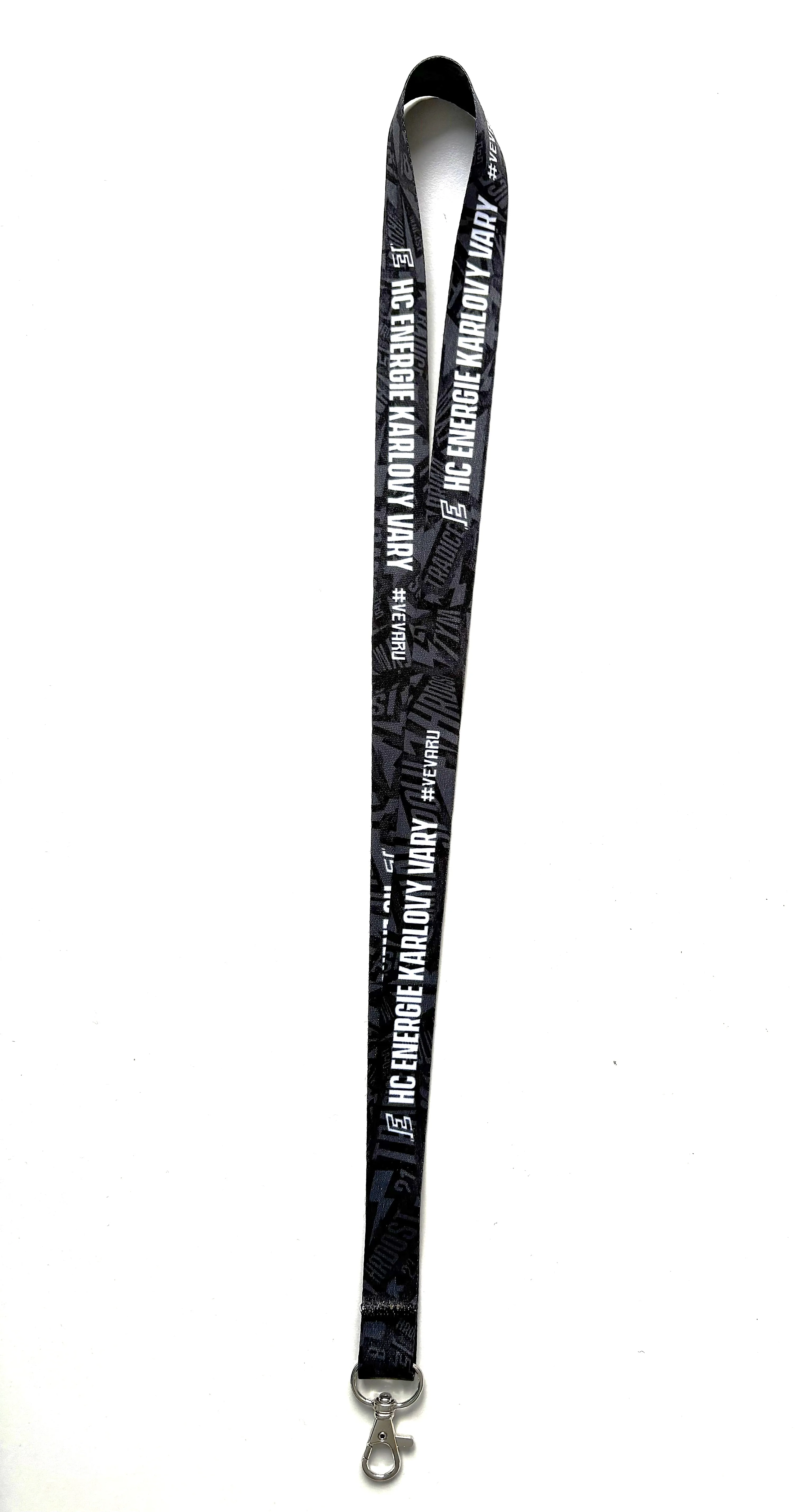 Oboustranná široká klíčenka na krk v klubových barvách HC Energie Karlovy Vary s nápisy HC ENERGIE KARLOVY VARY a #VeVaru.
